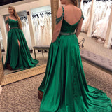 Off The Shoulder Beading Straps Green Satin Long Prom Dress